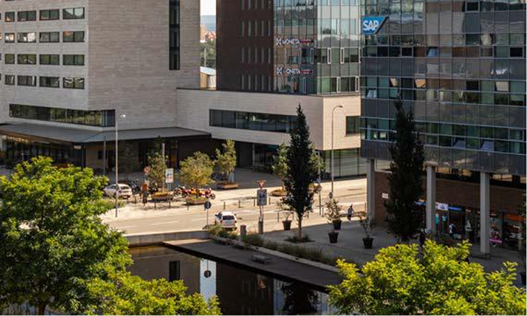 vlastní recepce, 492 parkovacích míst, kolárny a sprchy