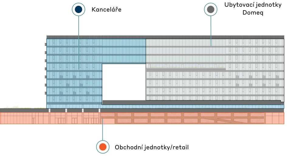 Moderní městská budova s 11 nadzemními podlažími propojuje kancelářské, retailové a ubytovací funkce do jednoho harmonického celku.